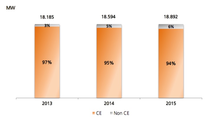Rispetto al 2014, gli impianti entrati in esercizio nell’anno sono diminuiti circa del 23% e si riduce del 30% anche la potenza installata; la differenza si spiega principalmente con l’entrata in esercizio durante il 2014 degli ultimi impianti in Conto Energia.