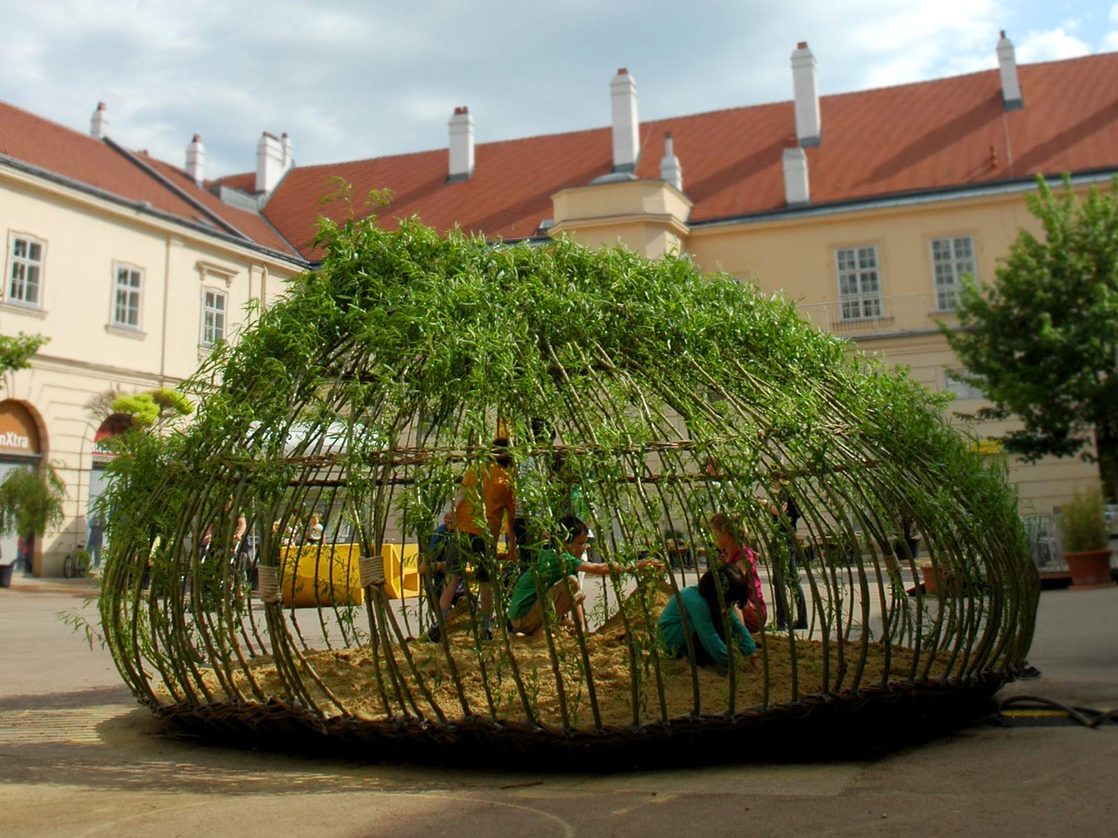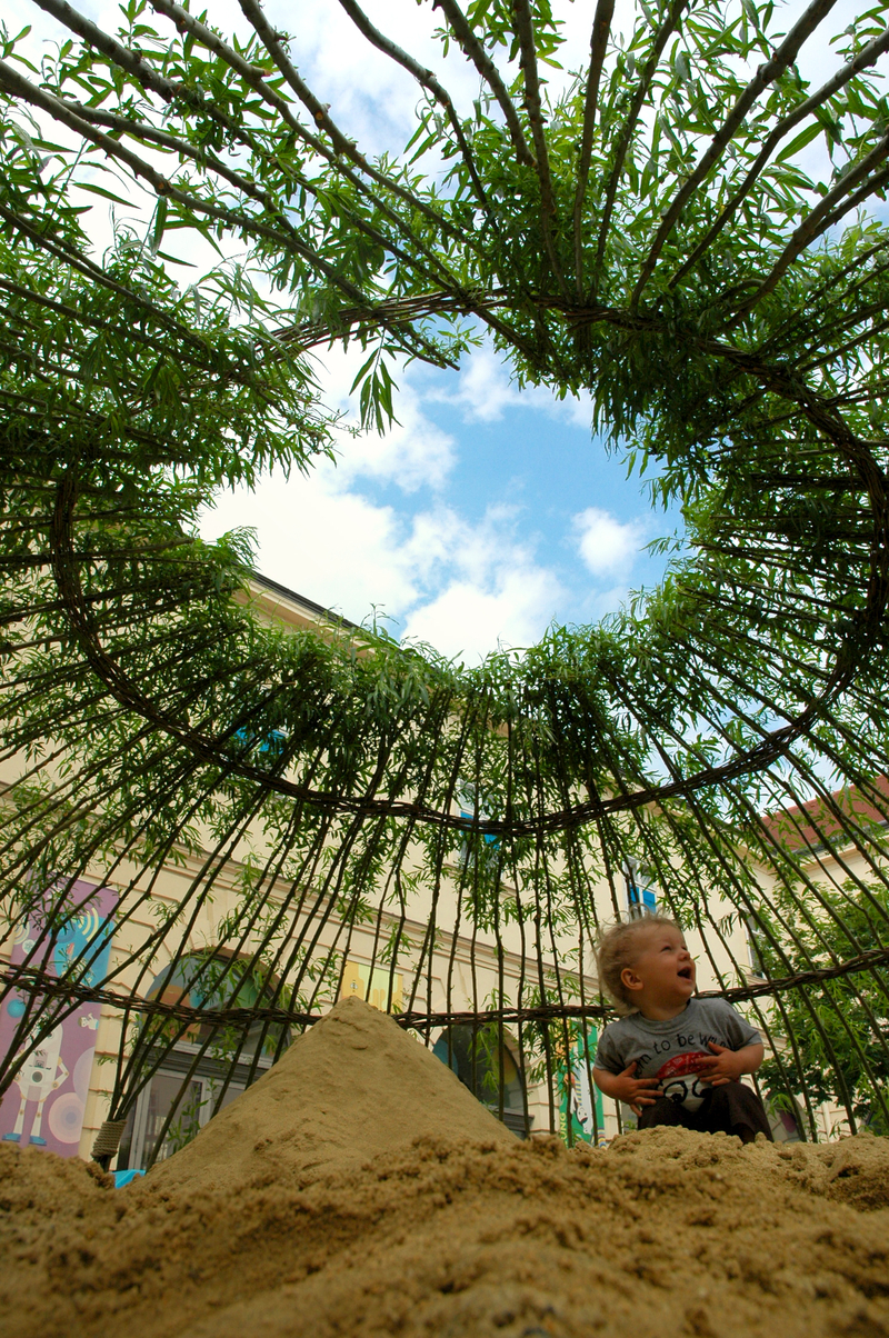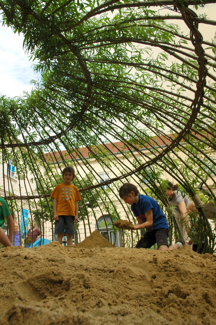 PROGETTO ECOLOGICO. L’idea della struttura vivente è dello Studio PPAG Architects, in collaborazione con Julia Stefanie Meyer e Simon Oberhammer. L’opera ha trovato posto nel MQV, il Quartiere dei Musei di Vienna, dove si voleva realizzare un parco giochi davvero speciale. Lo studio PPAG ha spiegato: «Realizzare un semplice spazio giochi con la sabbia, come richiesto dall’amministrazione museale, non rappresentava di per sé una grande sfida. Quando è stato il momento di escogitare una soluzione per riparare i bambini dal sole, ci è venuta l’idea di realizzare una schermatura solare fatta di piante Abbiamo così sperimentato la costruzione di una casa vivente». Forse si è aperta una nuova strada per i parchi giochi del futuro: non più tubi di metallo e acciaio ma fronde verdi e natura.