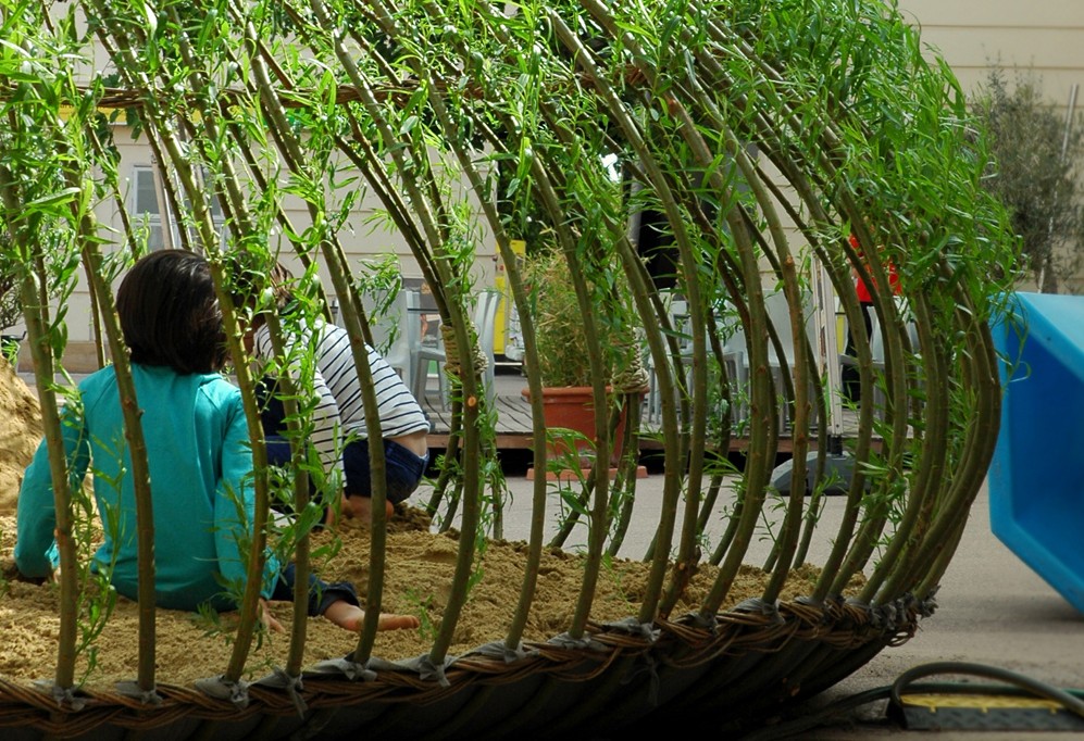 COM’È FATTA KAGOME. La struttura è formata da piantoni di salice lunghi cinque metri che affondano le radici in un bacino di terra coperta da una membrana geotessile e da sabbia. La forma della struttura è data da cerchi rimovibili in acciaio. Sono stati poi posizionati in orizzontale dei rami finemente intrecciati, inseriti a tre altezze diverse. Questa specie di cipolla, composta da piante vive, non solo ha delle fronde che proteggono i bambini dal sole, ma cambia continuamente, crescendo in modo assolutamente naturale.