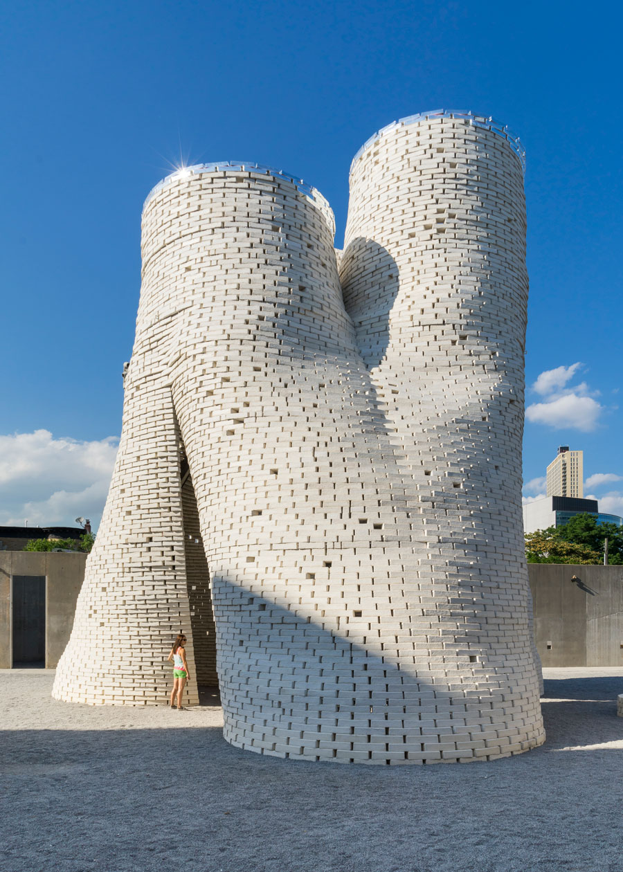 I MATTONI FATTI DI PANNOCCHIE E RADICI. Ogni anno il MoMa, il museo d’arte moderna più importante del mondo, organizza un concorso per realizzare un’istallazione temporanea nel cortile di una sua sede distaccata nel Queens. Il progetto deve essere completamente ecosostenibile, realizzato quindi unicamente con materiali ecologici e riciclabili. Il vincitore di quest’anno è stato David Benjamin con le sue torri circolari Hy-Fi, fatte interamente con mattoni biologici. Si tratta di una materiale completamente nuovo, costituito da steli di pannocchie e radici vive che, nella crescita, diventano un vero e proprio cemento naturale.