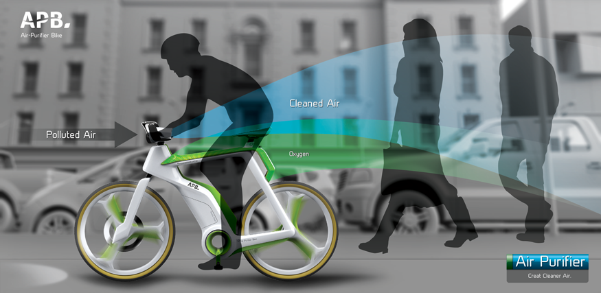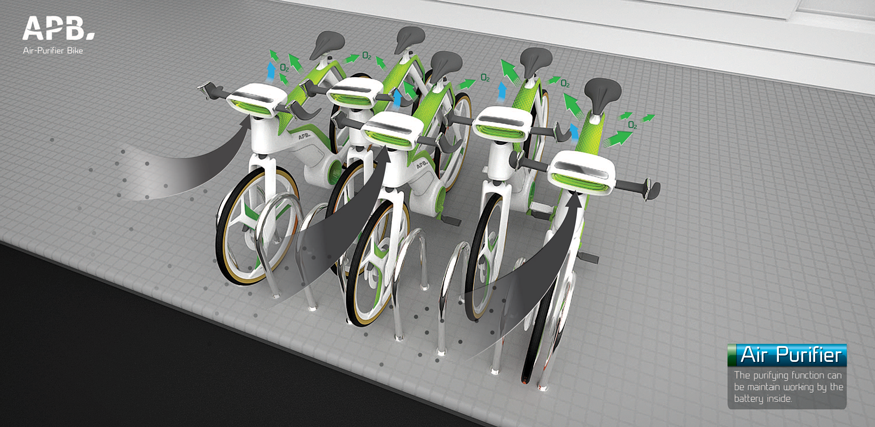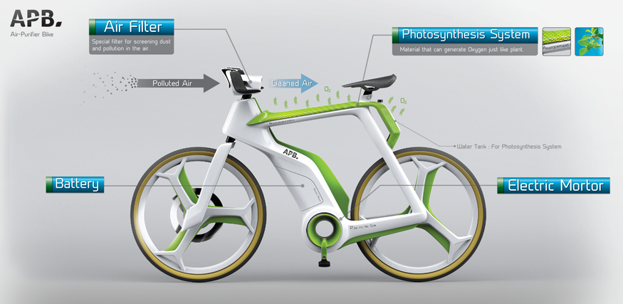 FILTRARE ARIA ANDANDO IN BICICLETTA. Uno dei motivi per cui spesso è difficile muoversi in città usando la bicicletta è l’inquinamento. Non è piacevole, infatti, fare attività fisica in mezzo a gas di scarico e polveri sottili. Devono aver pensato questo i designer della Lightfog Creative and Design Company di Bangkok nel progettare la Photosynthesys Bike. Un filtro posto sul manubrio consente infatti alla bicicletta di catturare le sostanze inquinanti, rilasciando poi aria pulita. Anche Il telaio di questa particolare due ruote produce ossigeno attraverso un processo di fotosintesi. Grazie ad una batteria al litio, la bicicletta è inoltre in grado restituire aria pulita anche da ferma.