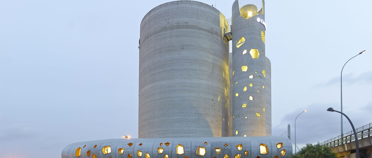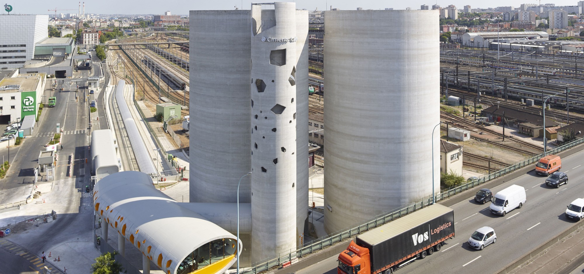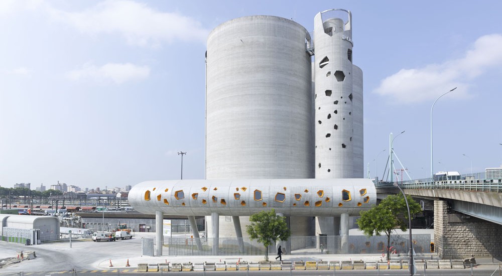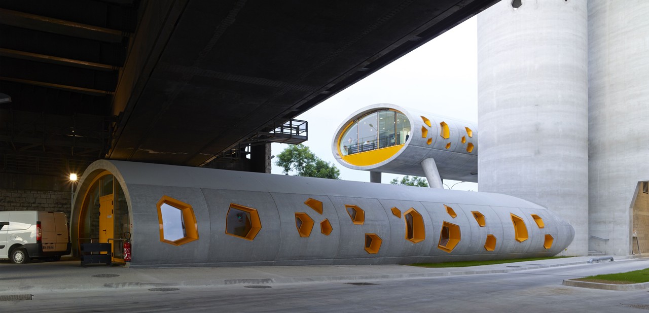 LA SCULTURA INDUSTRIALE. Lo Studio VIB Architecture ha realizzato per il nuovo quartiere di Bruneseau, a nord di Parigi, un progetto assai ambizioso. Poiché l’area è un importante centro industriale, l’obiettivo era di creare per la Ciment Calcia, un edificio che non fosse solo funzionale, ma anche artistico, sostenibile e dal basso impatto ambientale. L’idea di partenza dei progettisti è stata quella di riprendere il vecchio concept del classico silos industriale, modificandolo tanto da farlo diventare una vera e propria scultura. Un problema per gli architetti è stato quello di dover disegnare un edificio situato ad appena 5 metri dalla tangenziale est di Parigi. Proprio questa ulteriore difficoltà ha portato i progettisti a realizzare strutture sia verticali, ben visibili dalla strada, sia orizzontali, su palafitte o appoggiate al suolo.