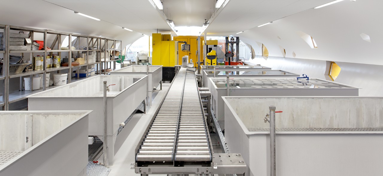 COME SCEGLIERE LUOGO E MATERIALI. Per ciò che riguarda l’uso dei materiali, gli architetti hanno ritenuto indispensabile che il fabbricato fosse costruito con il cemento prodotto dalla stessa Ciment Calcia. Tutto, silos, scale, uffici, il centro per i test e il piano terra, è interamente fatto di cemento, sottolineando in tal modo anche il potenziale plastico di questo componente. Inoltre, poiché all’interno dei silos la luce era insufficiente, lungo le pareti sono state aperte delle finestre la cui forma ricorda le pietre usate per la fabbricazione del calcestruzzo e, al posto del vetro è stata utilizzata una semplice rete in acciaio inox. Anche il luogo della costruzione non è stato scelto a caso: l’area circoscritta dalla ferrovia e dal fiume Senna consente di trasportare i materiali verso il cantiere con minor dispendio di mezzi possibili, incidendo poco sull’ecosistema del luogo. Il 100% del cemento arriva infatti via treno.