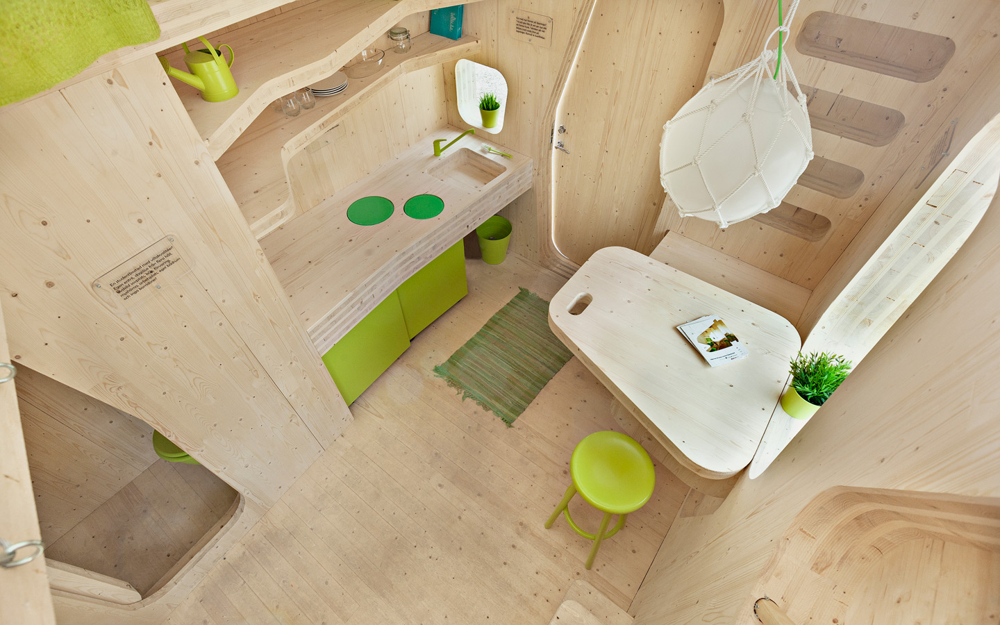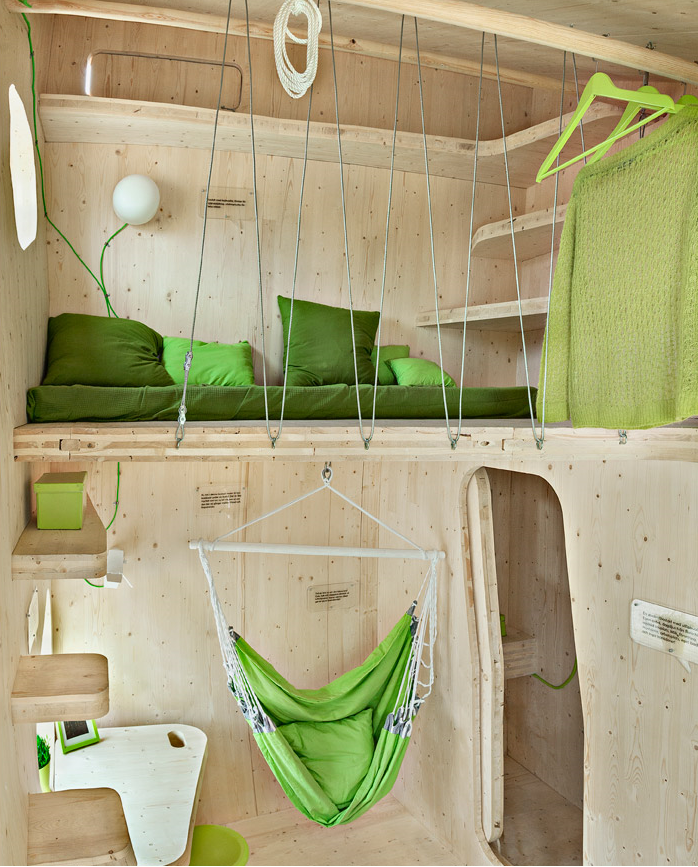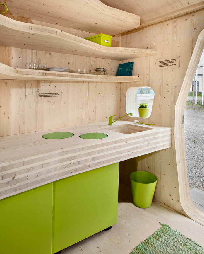 SPAZI INTELLIGENTI E FUNZIONALI. Dopo gli ex silos ristrutturati in Sudafrica e le case temporanee in Olanda, anche la Svizzera pensa ai propri studenti. Lo Studio Tengbom ha progettato dei mini appartamenti di soli 10 mq, così belli e funzionali da essere persino esposti al Museo d’Arte Virserum. Le unità abitative sono organizzare in questo modo: al piano terra troviamo la zona giorno che comprende, bagno, tavolo a ribaltamento, lavello, piano cottura e un’amaca che sostituisce il divano. L’ottimizzazione degli spazi è calcolata al millimetro: la scrivania ribaltabile, ad esempio, una volta sollevata davanti alla finestra fa da persiana. Alcune mensole fungono da scalini per salire nella zona notte dove si trova un piccolo soppalco con letto e armadio.