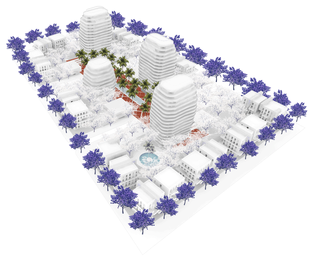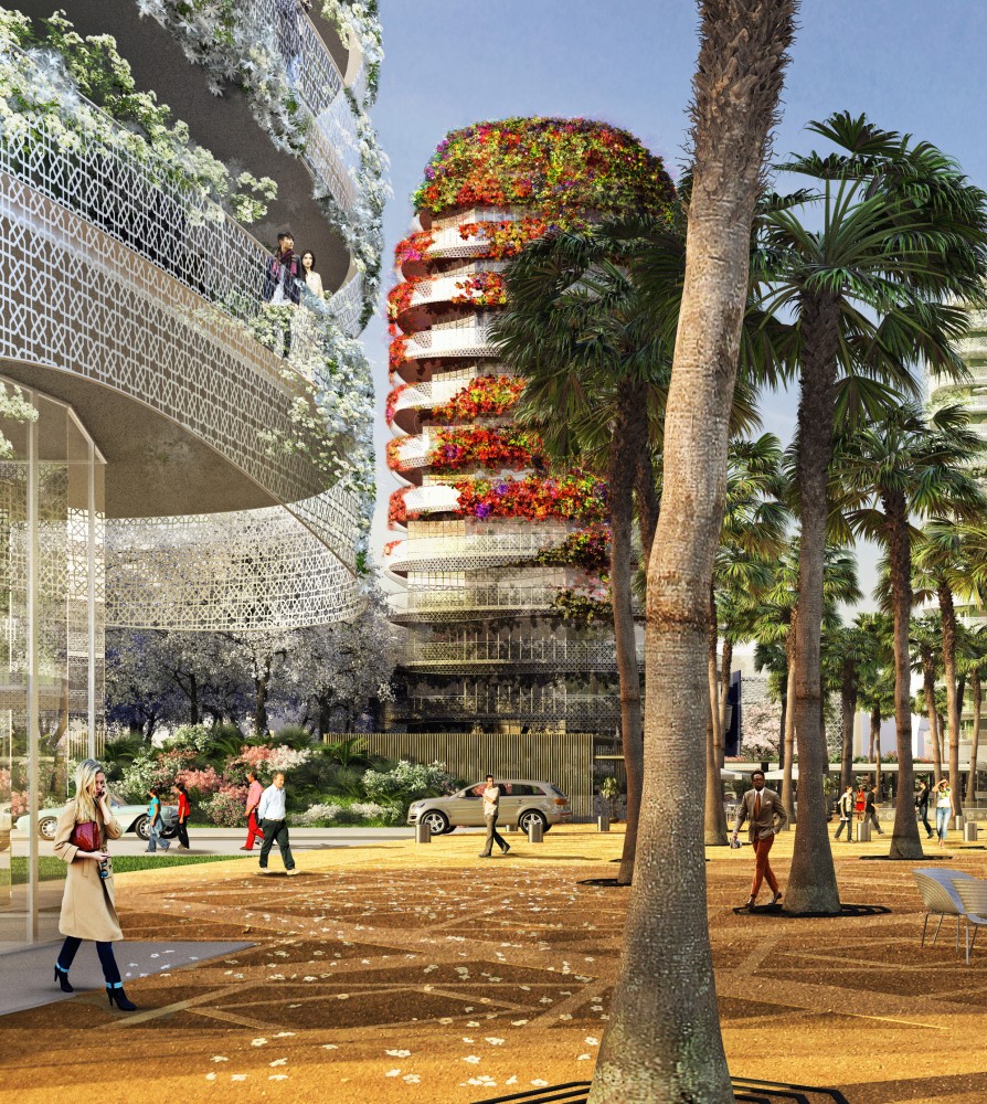 IL QUARTIERE CHE NON SI VEDE. Il progetto di 50.000mq prevede la costruzione di un vero e proprio quartiere che comprenderà anche spazi pubblici oltre ad un parcheggio sotterraneo. Tutt’intorno all’area saranno piantati degli alberi e dei cespugli di fiori bianchi e blu, per separare le torri dalle case più basse, poste ai margini del quartiere. In questo modo le diverse architetture saranno accompagnate ognuna dai colori delle piante loro assegnate, creando un piacevole effetto mimetico con il parco circostante.